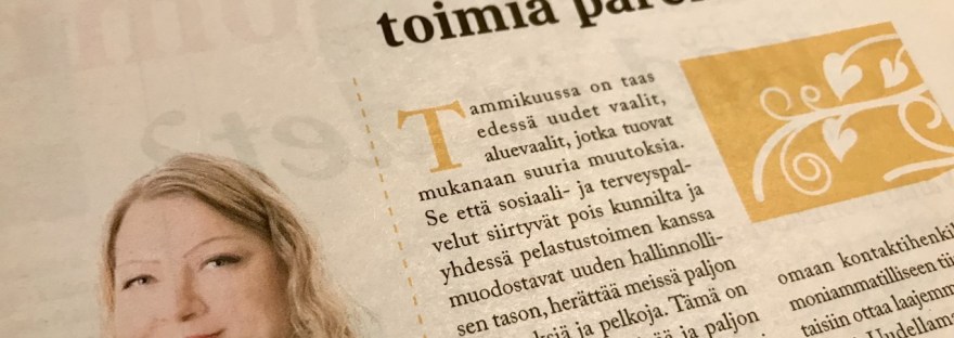 Tammikuussa on taas edessä uudet vaalit, aluevaalit, jotka tuovat mukanaan suuria muutoksia. Se että sosiaali- ja terveyspalvelut siirtyvät pois kunnilta ja yhdessä pelastustoimen kanssa muodostavat uuden hallinnollisen tason, herättää meissä paljon kysymyksiä ja pelkoja. Tämä on hyvin ymmärrettävää ja paljon onkin sellaista mistä meillä ei vielä tässä vaiheessa ole tietoa. Moni asia ratkaistaan vasta sitten… Fortsätt läsa Mahdollisuus toimia paremmin