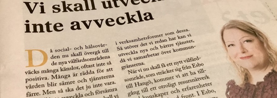 Då social- och hälsovården nu skall övergå till de nya välfärdsområdena väcks många känslor, oftast inte så positiva. Många är rädda för att vården blir sämre och tjänsterna färre. Men så ska det ju inte vara. Vi skall inte avveckla och försämra verksamheten utan i stället skall vi utveckla och göra det bättre. Det är… Fortsätt läsa Vi skall utveckla, inte avveckla.